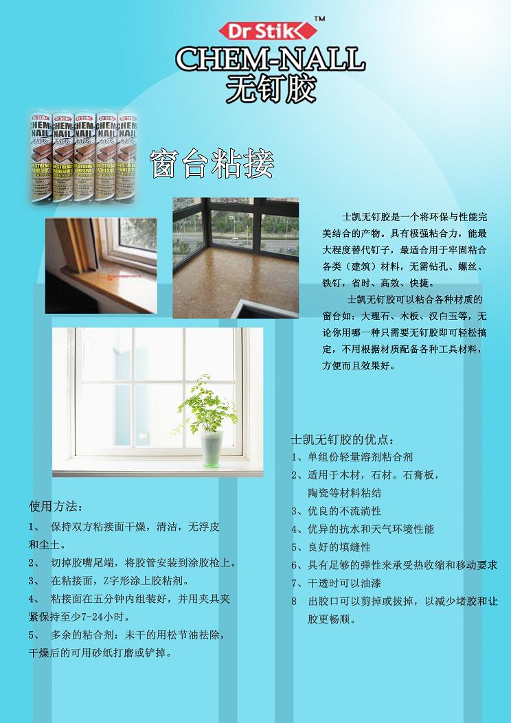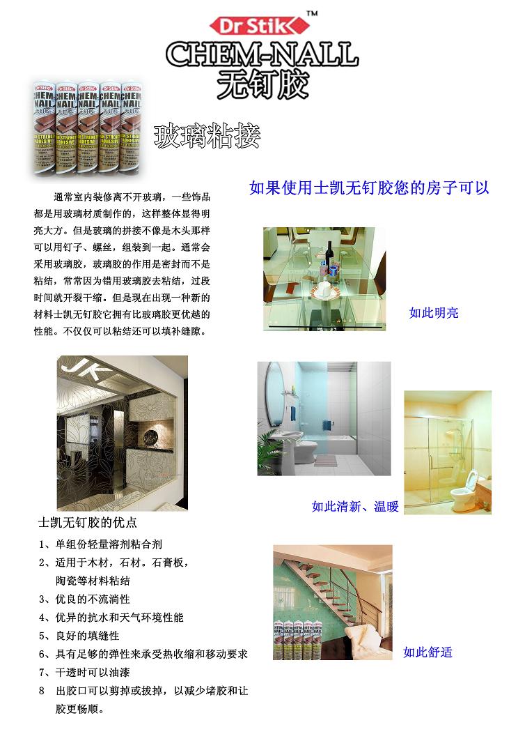 使用工具少,一把膠槍操作簡單??杀苊怃P漬和釘孔。士凱無釘膠中不摻雜任何有害物質(zhì),沒有有害氣體,是綠色環(huán)保,并且沒有噪音的多用途產(chǎn)品。